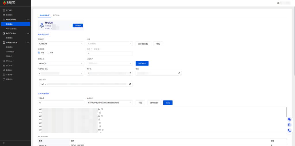 在辣椒HTTP后台获取住宅代理IP(可选静态或动态),包括IP地址、端口、账号和密码。