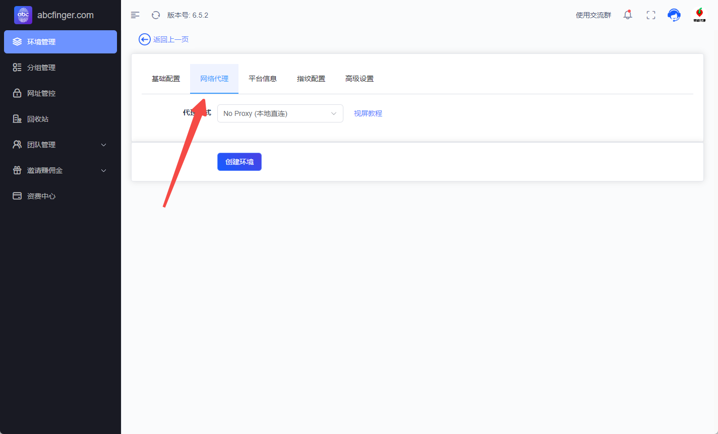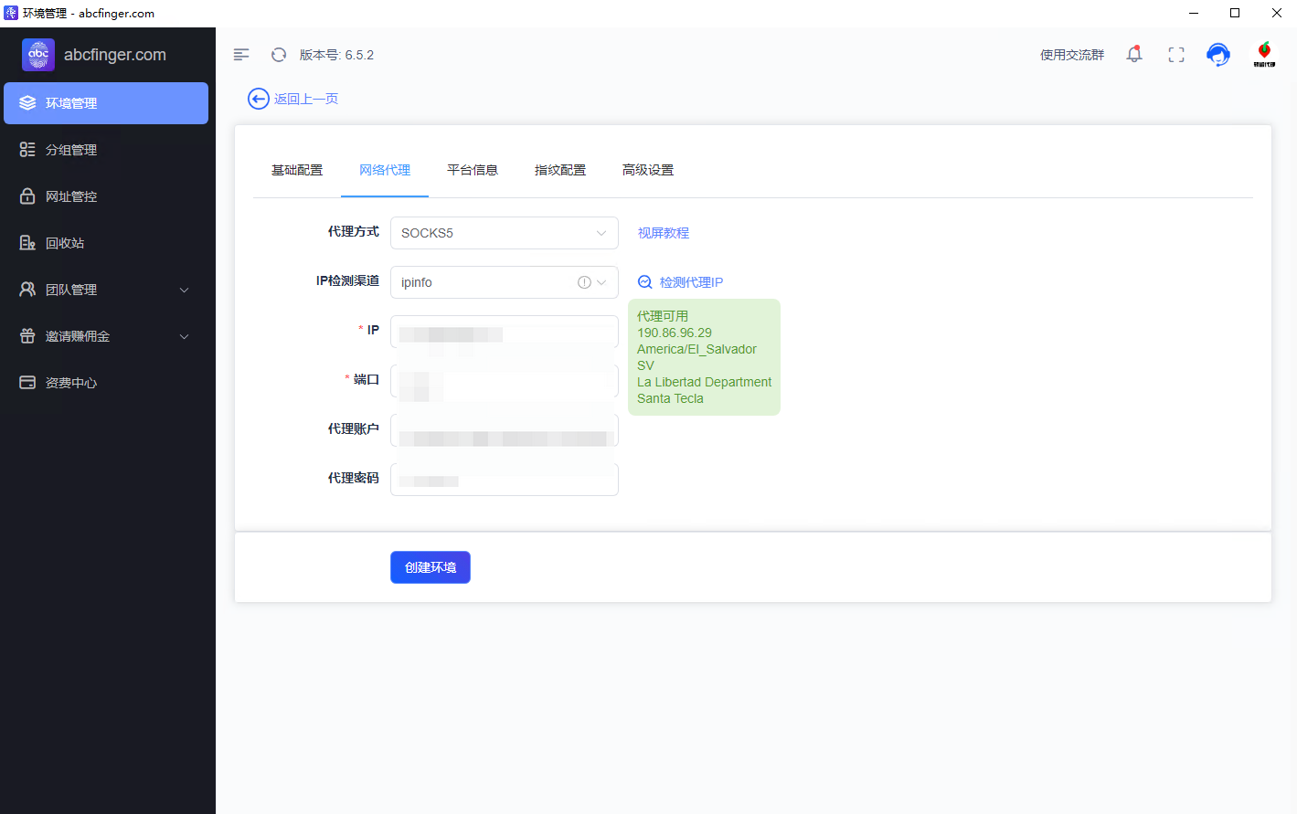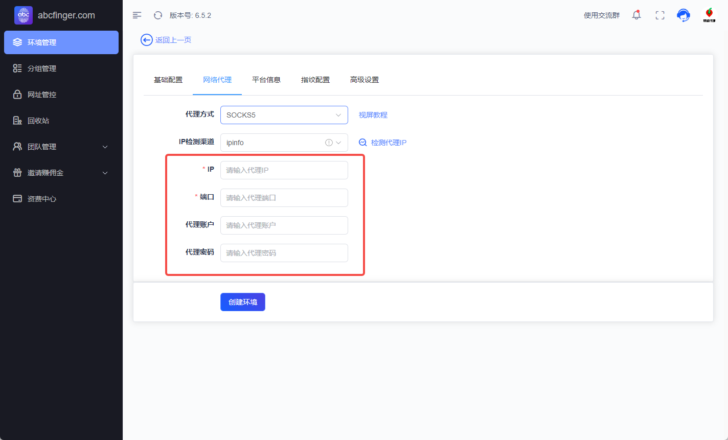 在【新建环境】下点击【网络代理】,AbcFinger提供了HTTP/HTTPS/SOCKS5等多种代理协议,推荐使用SOCKS5协议。