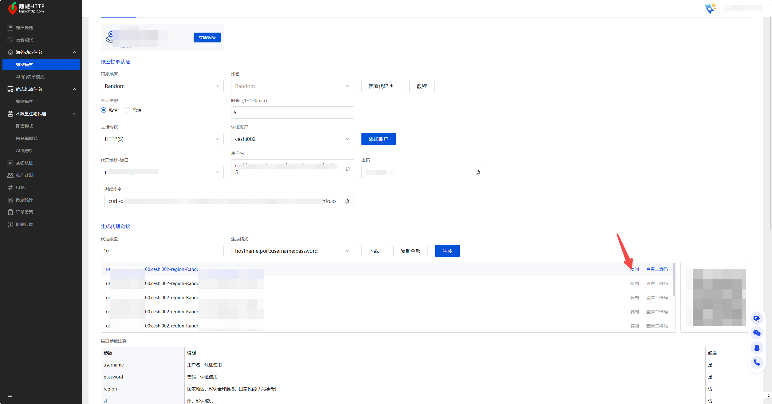 在动态住宅代理【账密模式】菜单下进行提取操作。