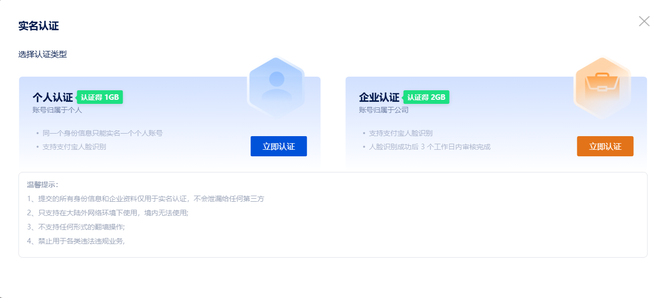 完成实名认证,个人用户可以免费获得1GB海外动态住宅代理,企业用户凭借营业执照可以免费获取2GB的海外动态住宅代理。