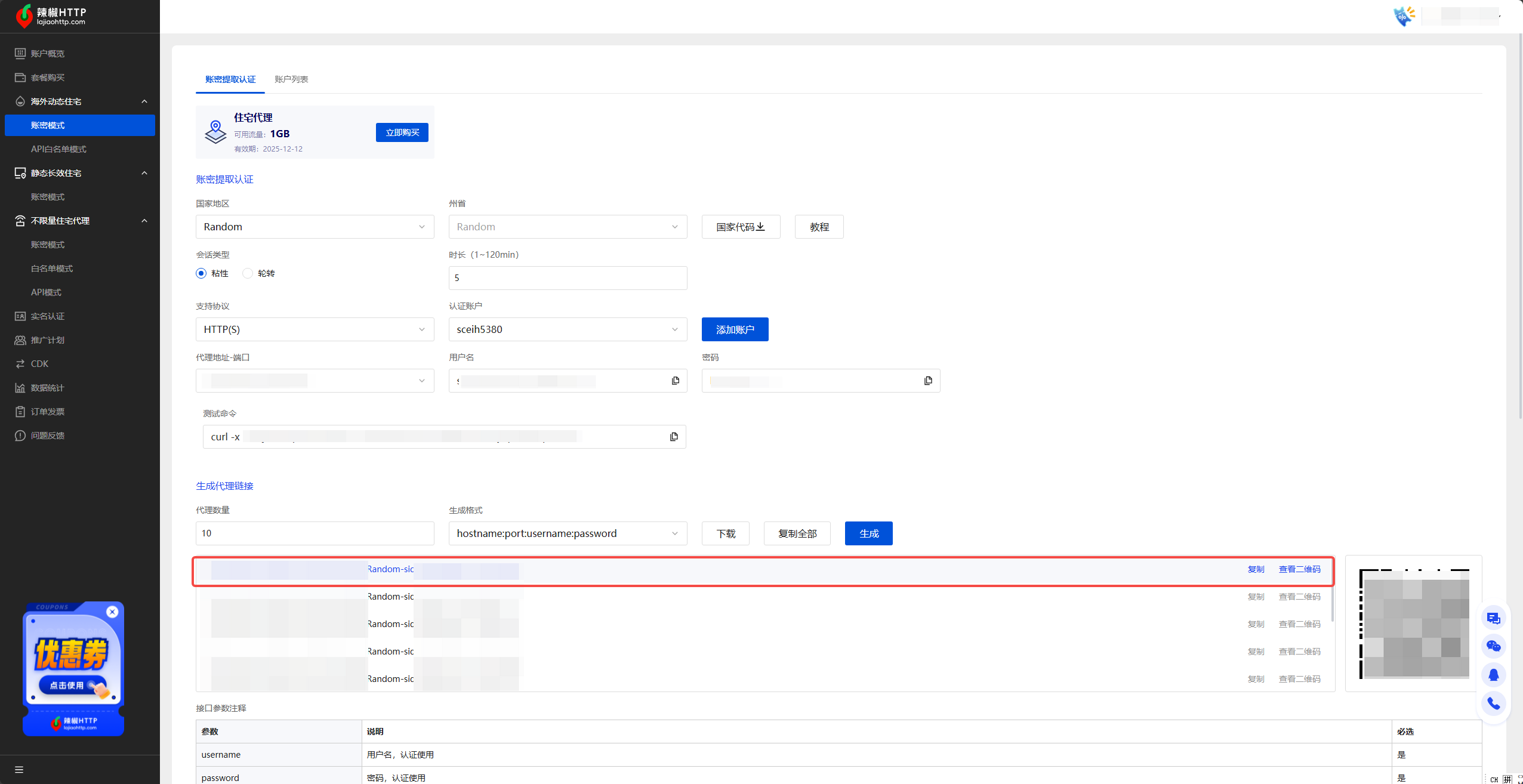 在动态住宅代理【账密模式】菜单下进行提取操作。