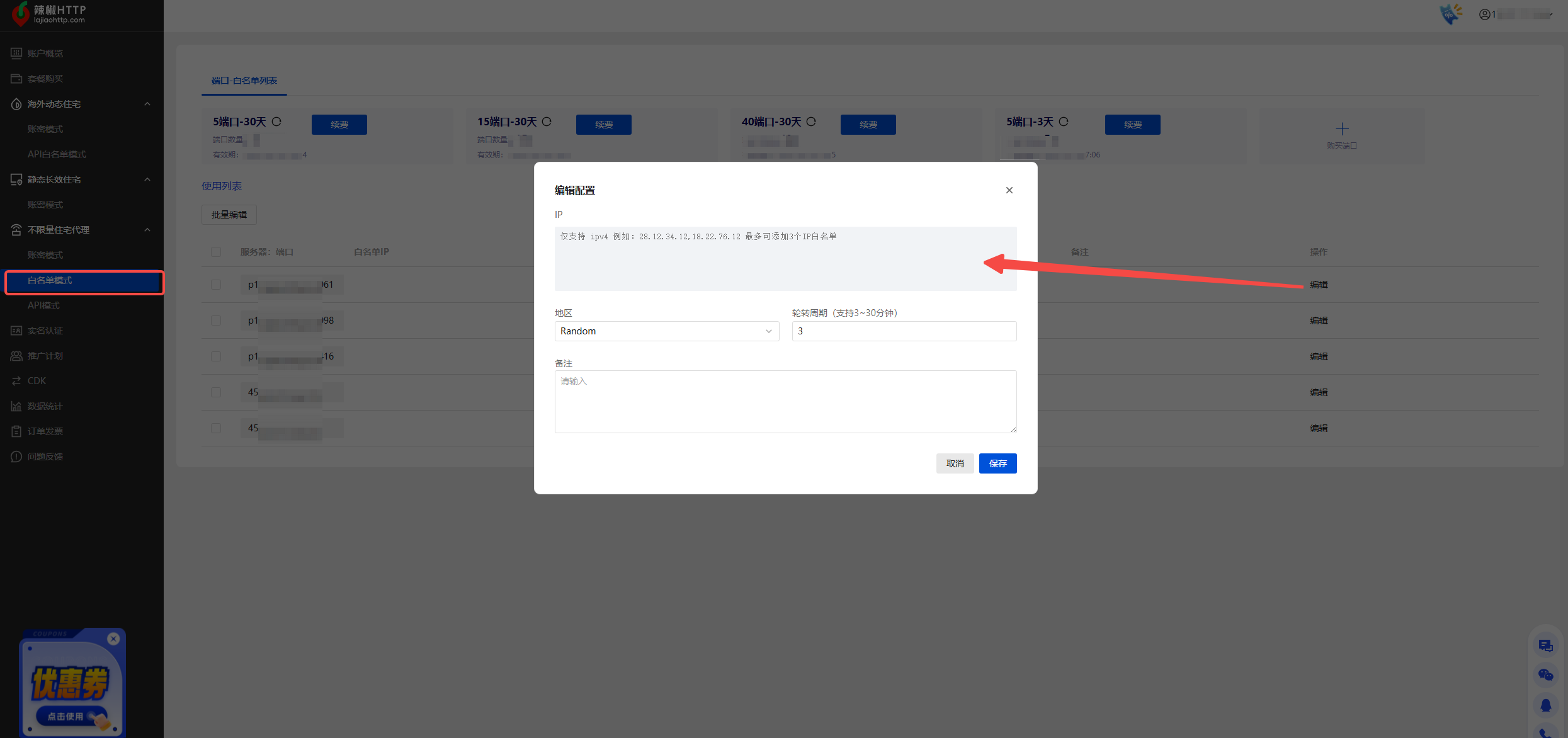 在不限量住宅代理-白名单模式下,购买完不限量-端口套餐后,选择指定的端口点击编辑,将本地信任的IP添加到输入框中。