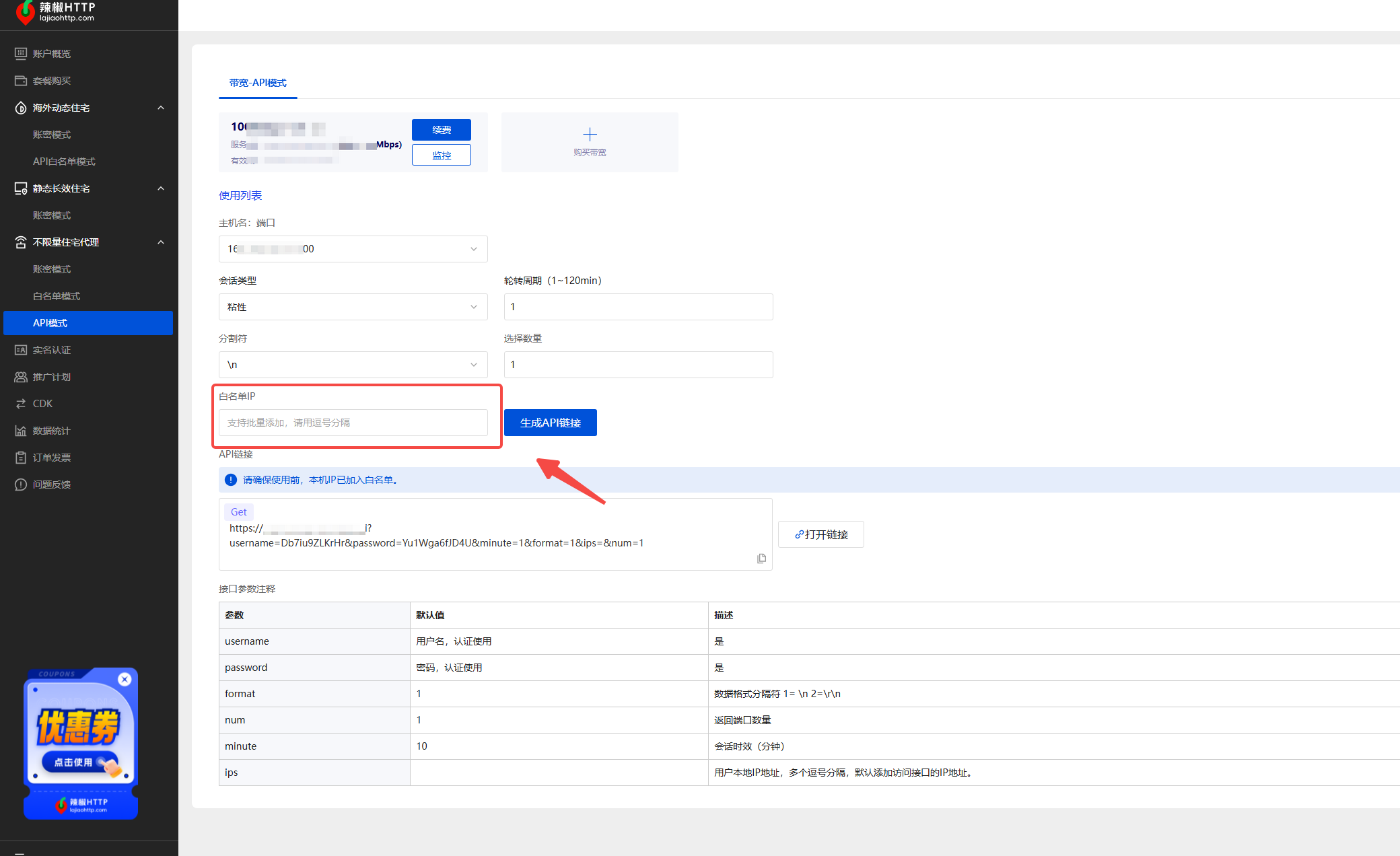 添加白名单后,可以选择需要生成的API链接。当你通过 API 获取到 IP 后,必须通过“白名单”验证你的身份,你才能真正连接上这些代理。