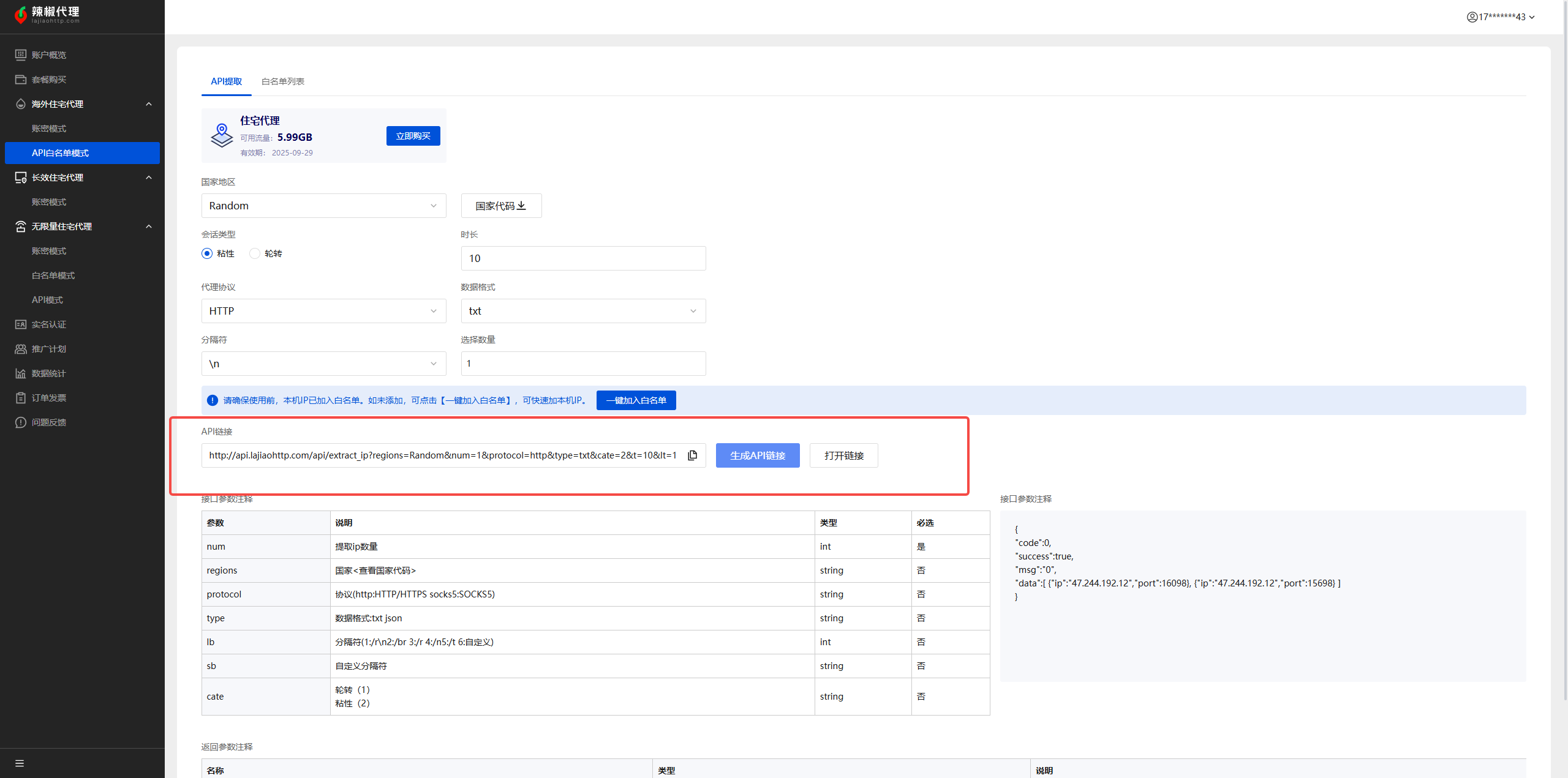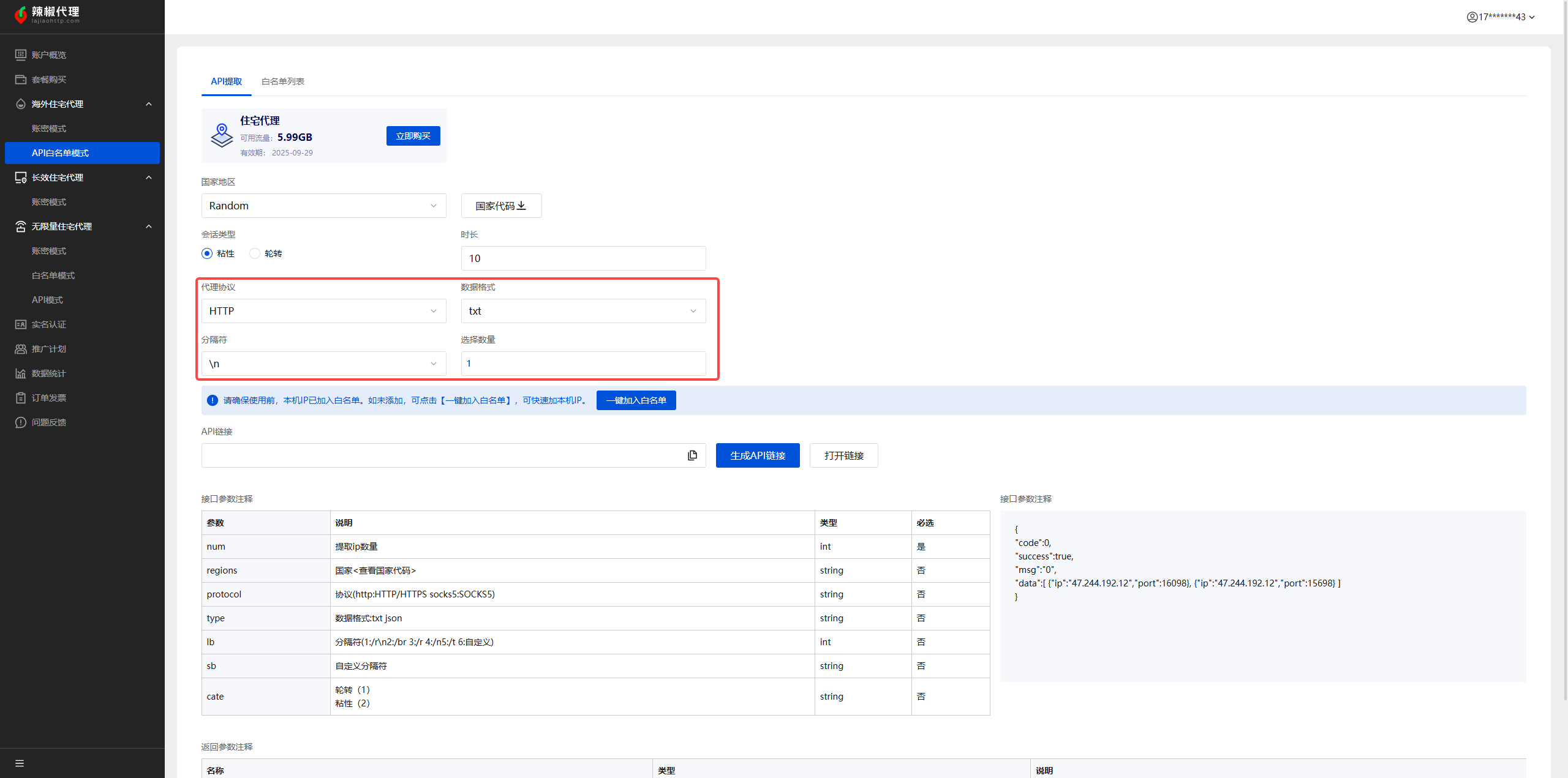 辣椒HTTP API 是实现自动化 IP 提取的高效方案。通过绑定 IP 白名单,您可以免去繁琐的手动身份验证(用户名与密码),实现无缝连接。用户只需通过调整 API 参数,即可精准获取所需 IP 资源。对于具备开发能力的开发者而言,该方式能显著降低人工干预成本,大幅提升业务的自动化运行效率。