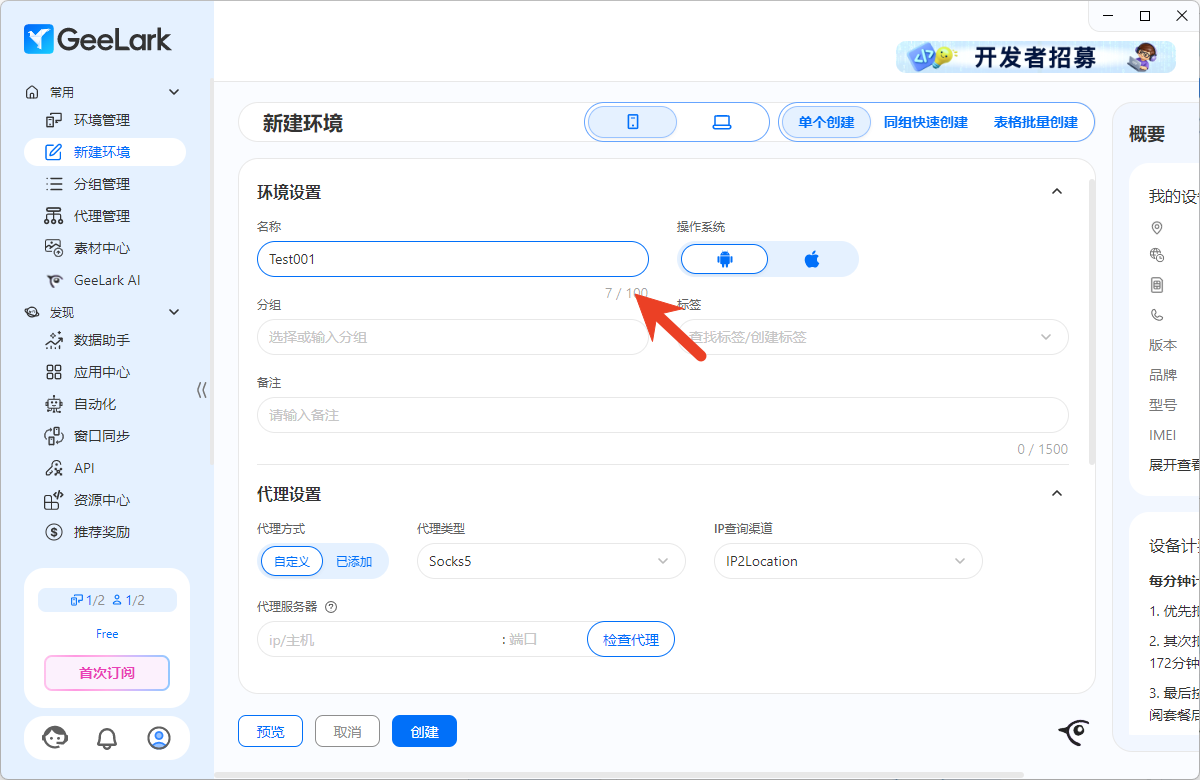 2.在【环境名称】字段中输入自定义名称,为当前的云手机实例建立唯一识别标识。