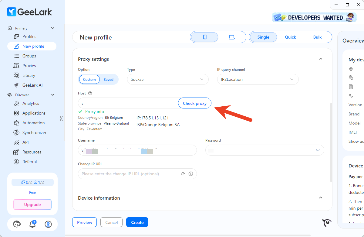 4.从辣椒HTTP的操作台中复制代理的账密信息并粘贴到Geelark代理环境的对应位置