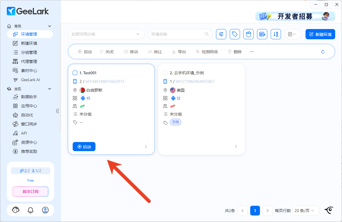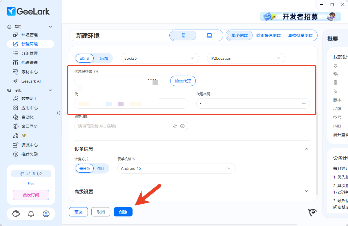 1.完成云手机客户端的安装与部署,随后点击右上角的【新建环境】以初始化您的首个云端实例。