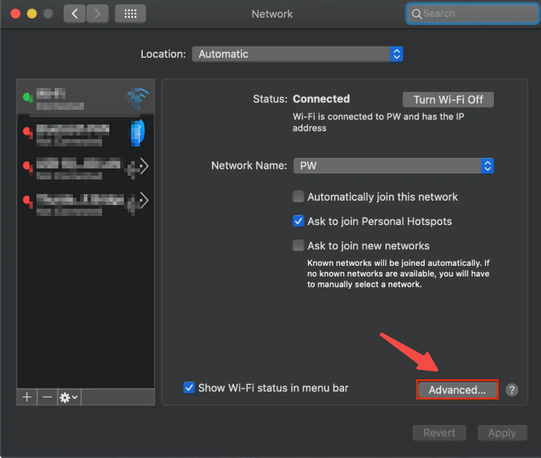 在弹出的网络窗口中,在当前连接的WIFI网络下,选择高级(Advanced)