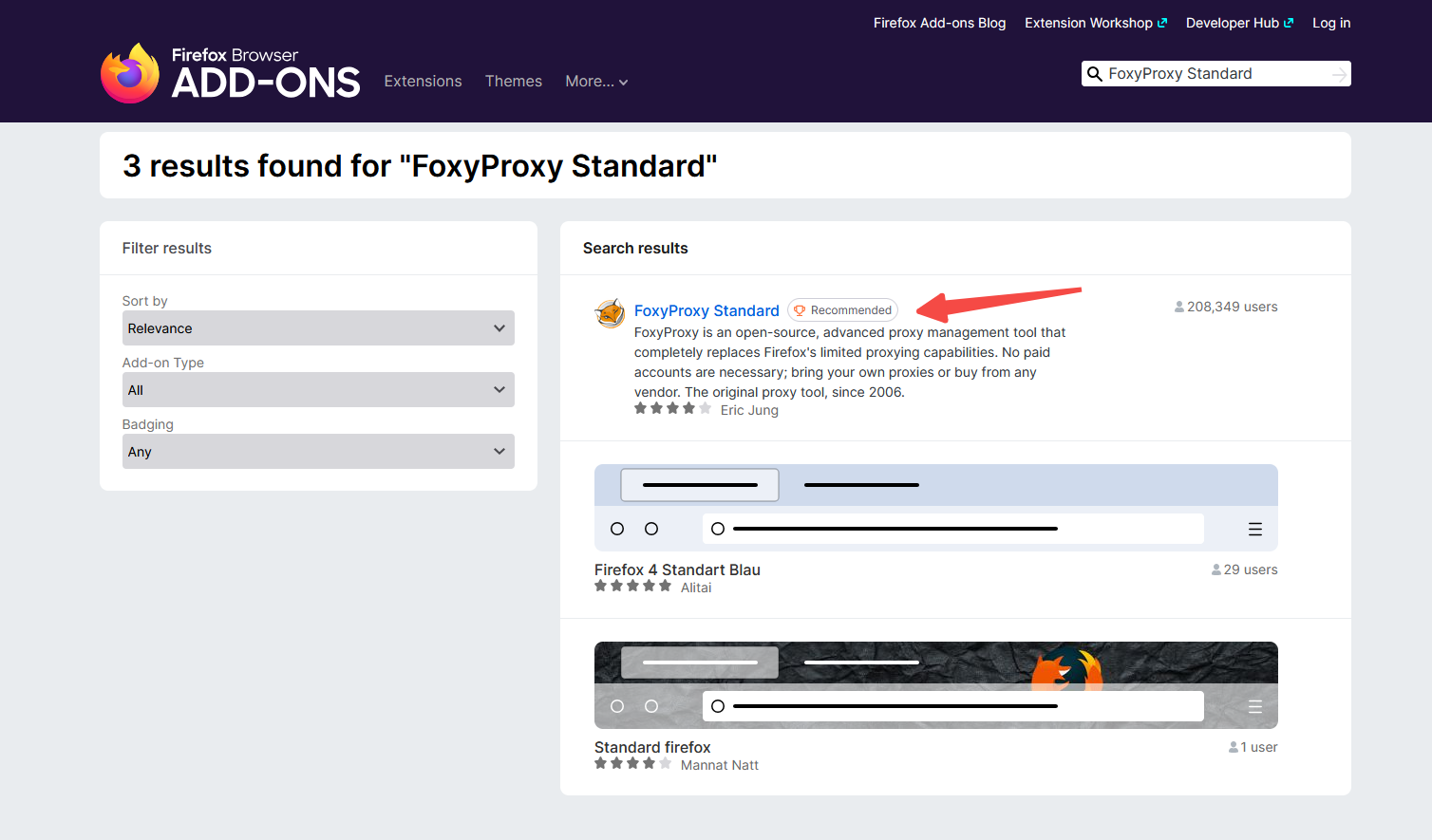 安装插件:在 Firefox 扩展商店搜索并安装 FoxyProxy 代理插件(FoxyProxy Standard)。