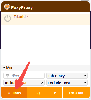 添加代理:点击浏览器工具栏的 FoxyProxy 图标,选择 【Options】。