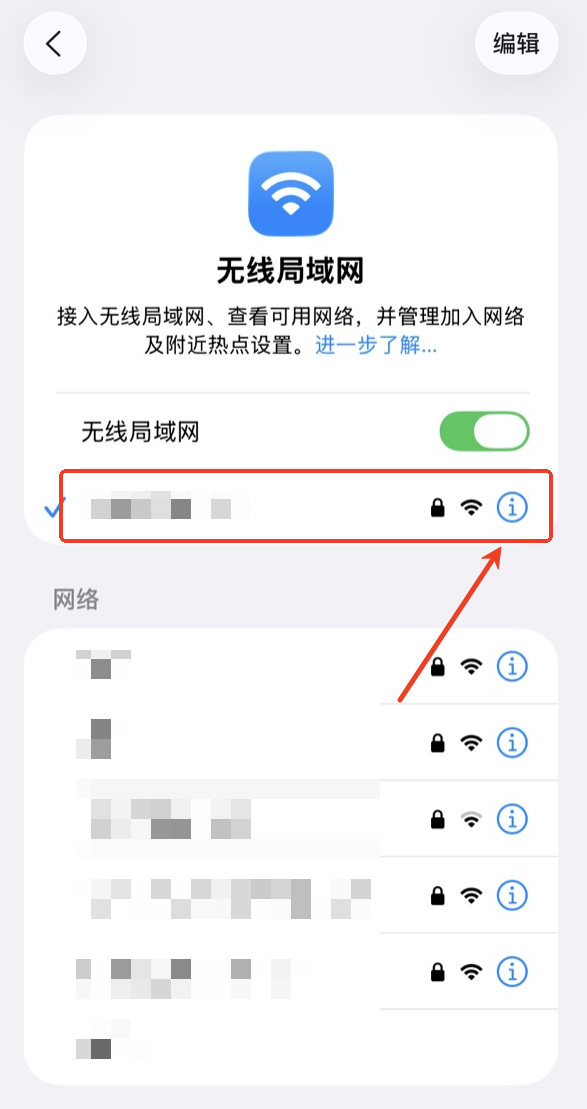 3.在无线局域网列表中,定位至当前已连接的 Wi-Fi,并点击其右侧蓝色的‘i’详情图标。