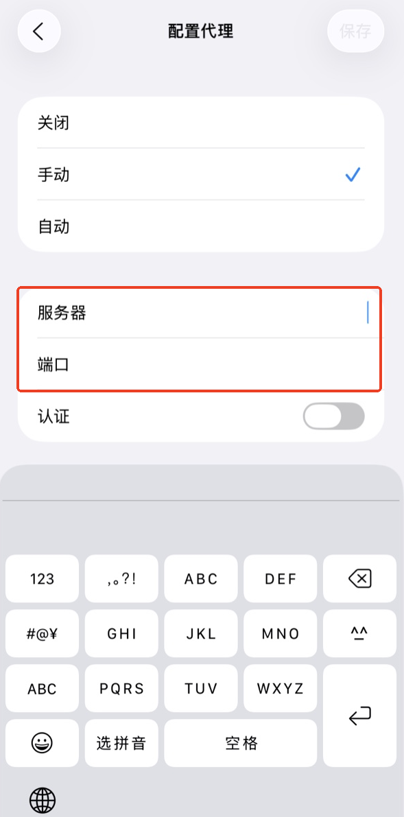 5.将代理模式切换至【手动】,随后将从辣椒 HTTP控制台获取的服务器地址与端口号准确填入对应框内。最后点击右上角的【保存】,即可激活当前的代理配置。