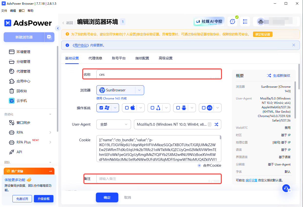完成基础设置的信息填写,为当前的浏览器窗口设置名称、浏览器内核、以及当前额备注信息等