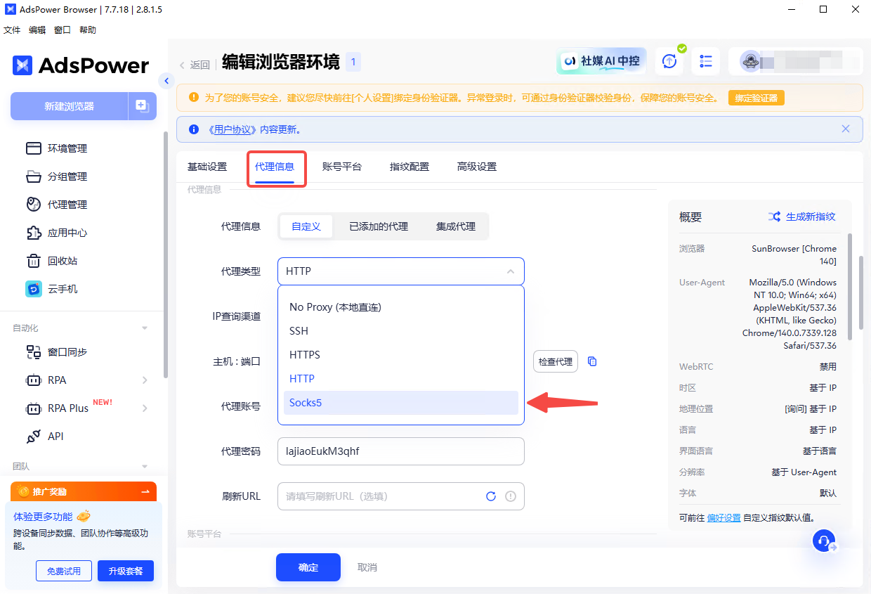 再选中代理信息板块,Adspower支持多种代理类型,此处我们优先选择SOCKS5