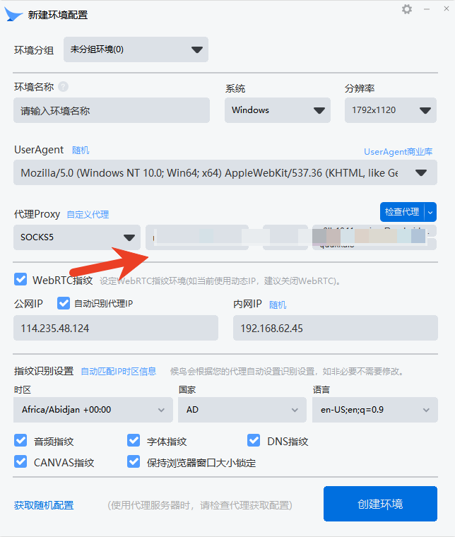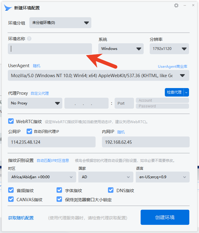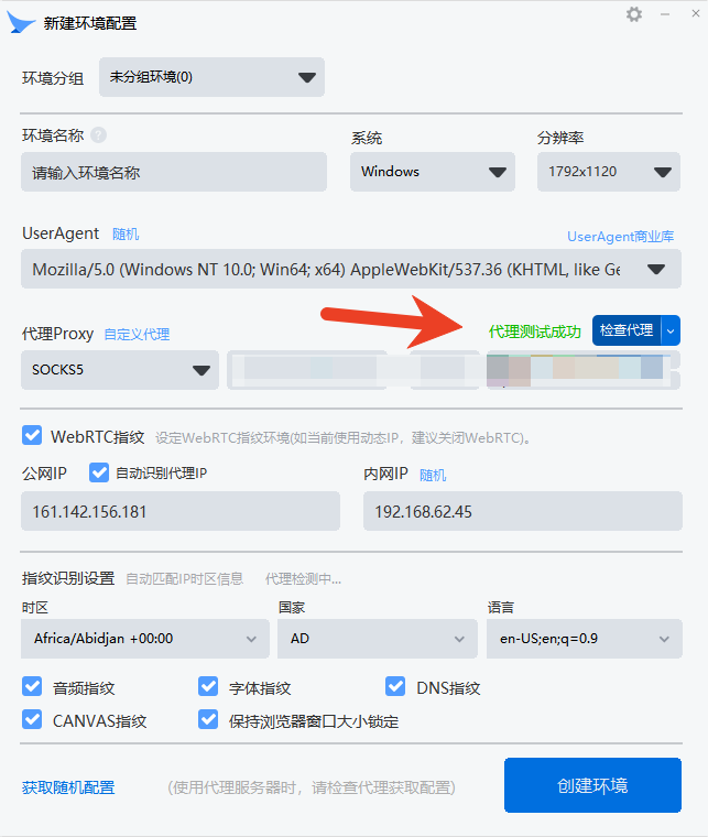 8.点击按钮【创建环境】,完成当前指纹浏览器窗口的配置。