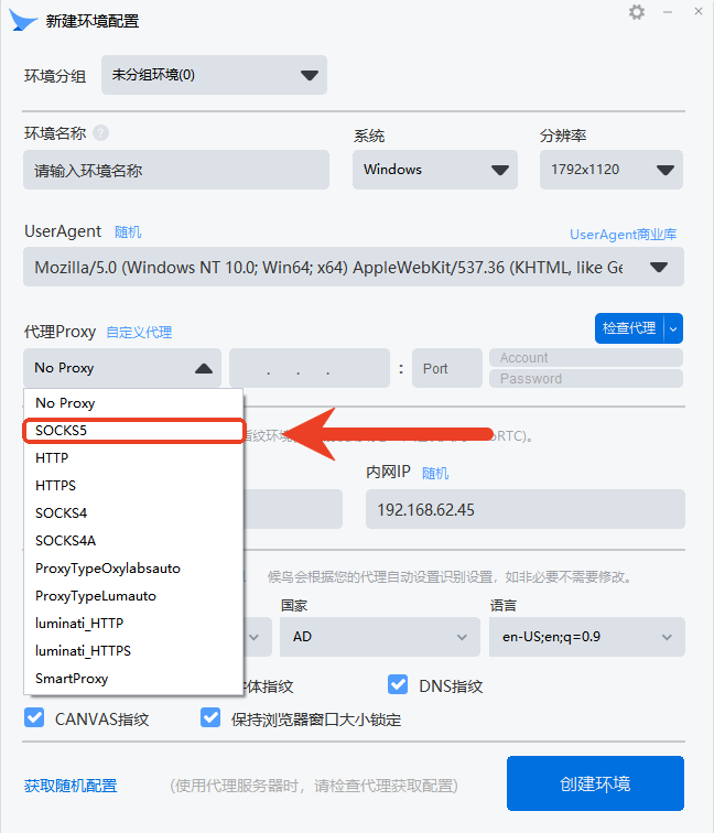 1.点击左下角的【新建环境配置】按钮,开始构建一个新的独立指纹环境。