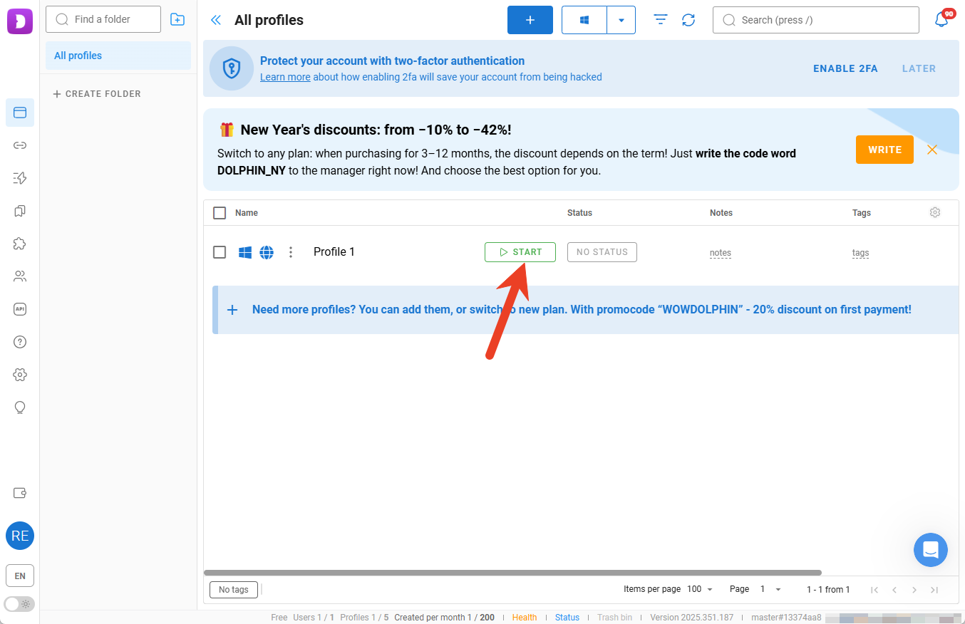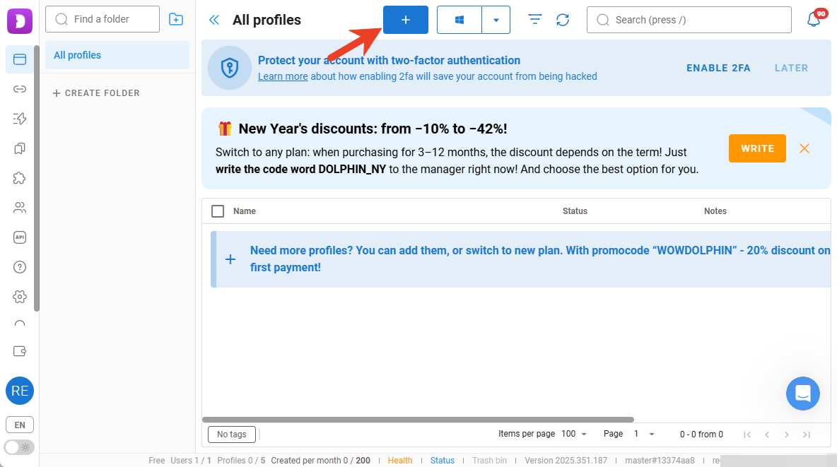 1.点击界面右上角的“+”按钮,即可开启【创建配置文件(Create Profile)】流程,为您接下来的业务构建一个新的独立浏览器环境。