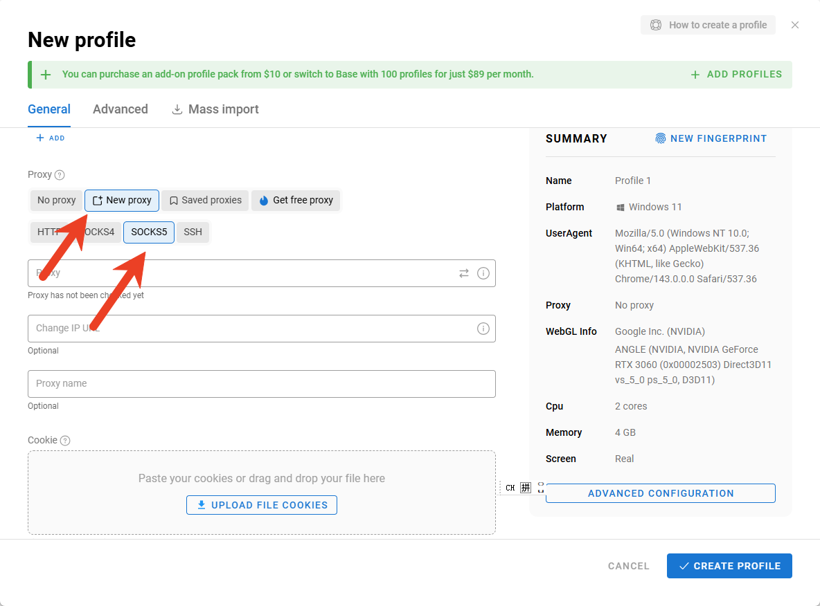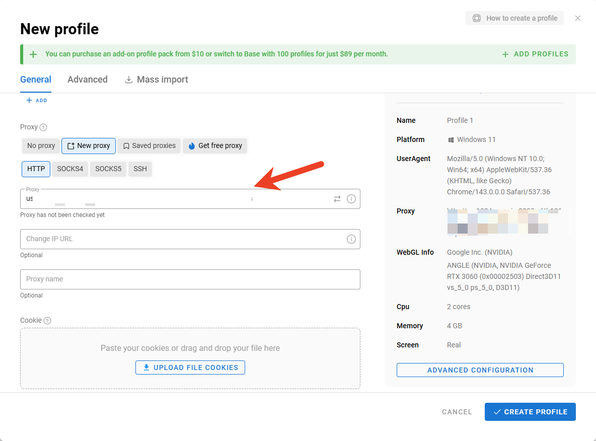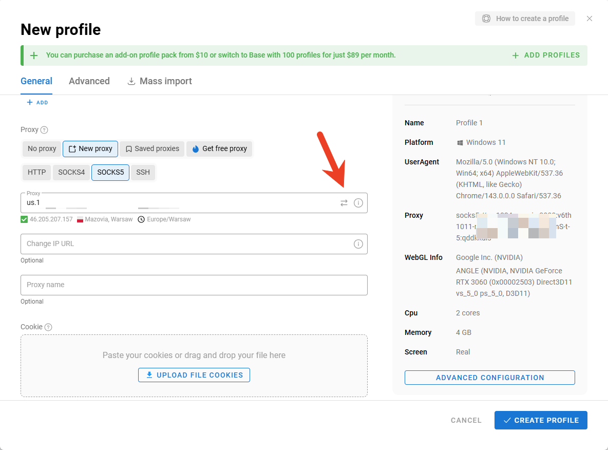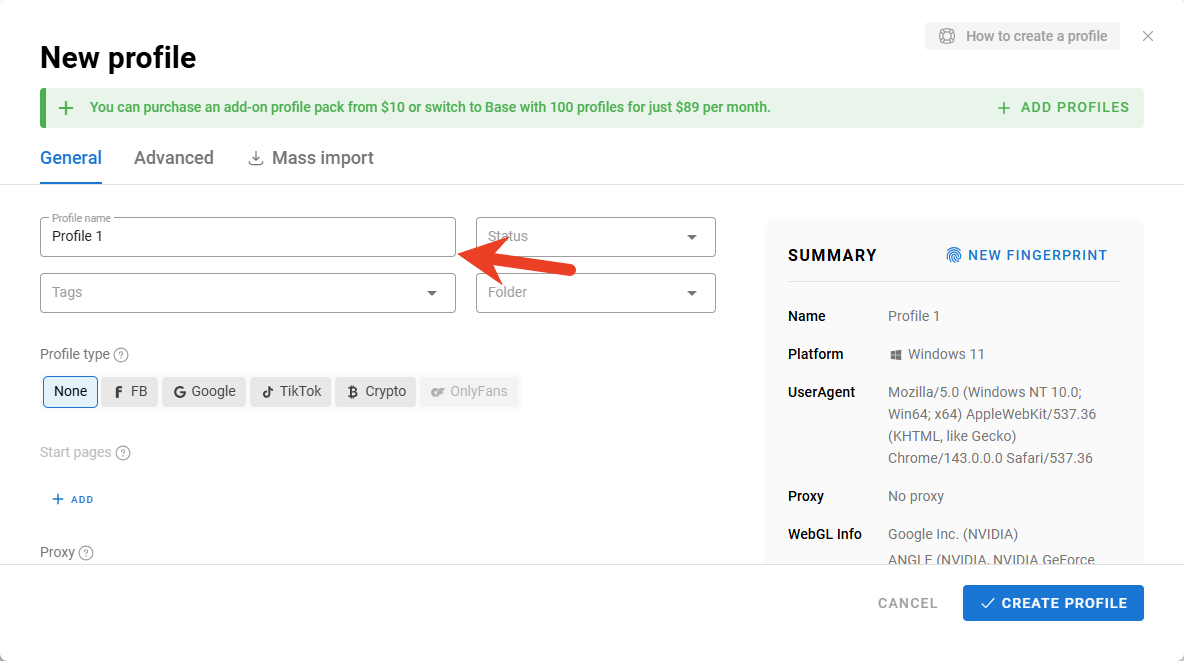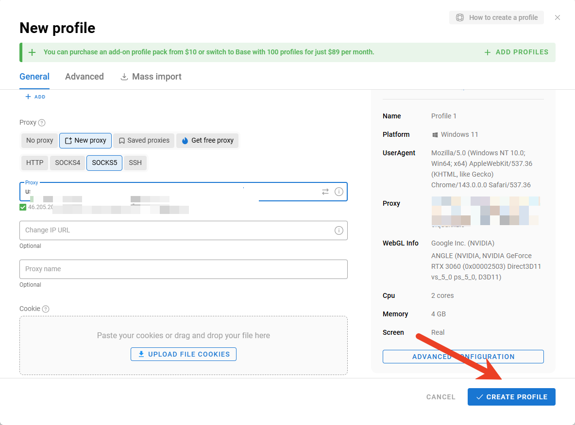 6.完成环境构建: 核对各项参数无误后,点击 【Create Profile】 按钮。系统将正式生成该指纹实例,并将其保存至您的浏览器环境列表中。